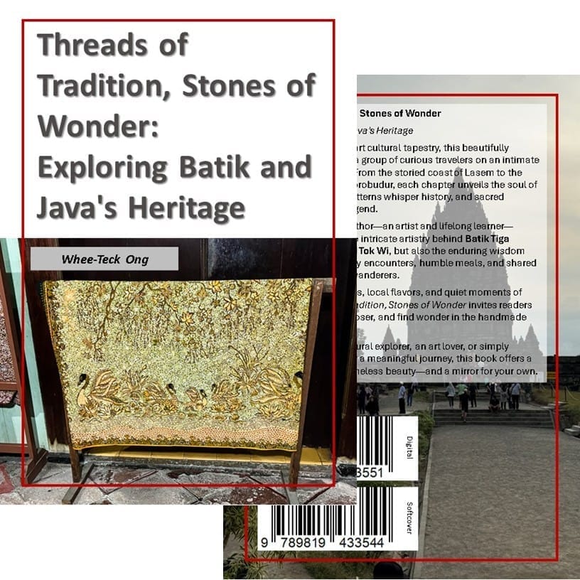 Journey through the heart of Java where ancient traditions live and breathe in every thread and carved stone. In this captivating travelogue, Whee Teck Ong takes readers on an intimate exploration of Indonesia's batik heartland—from the coastal workshops of Pekalongan to the royal courts of Solo, through the Chinese-Javanese heritage of Lasem to the sacred temples of Borobudur and Prambanan.