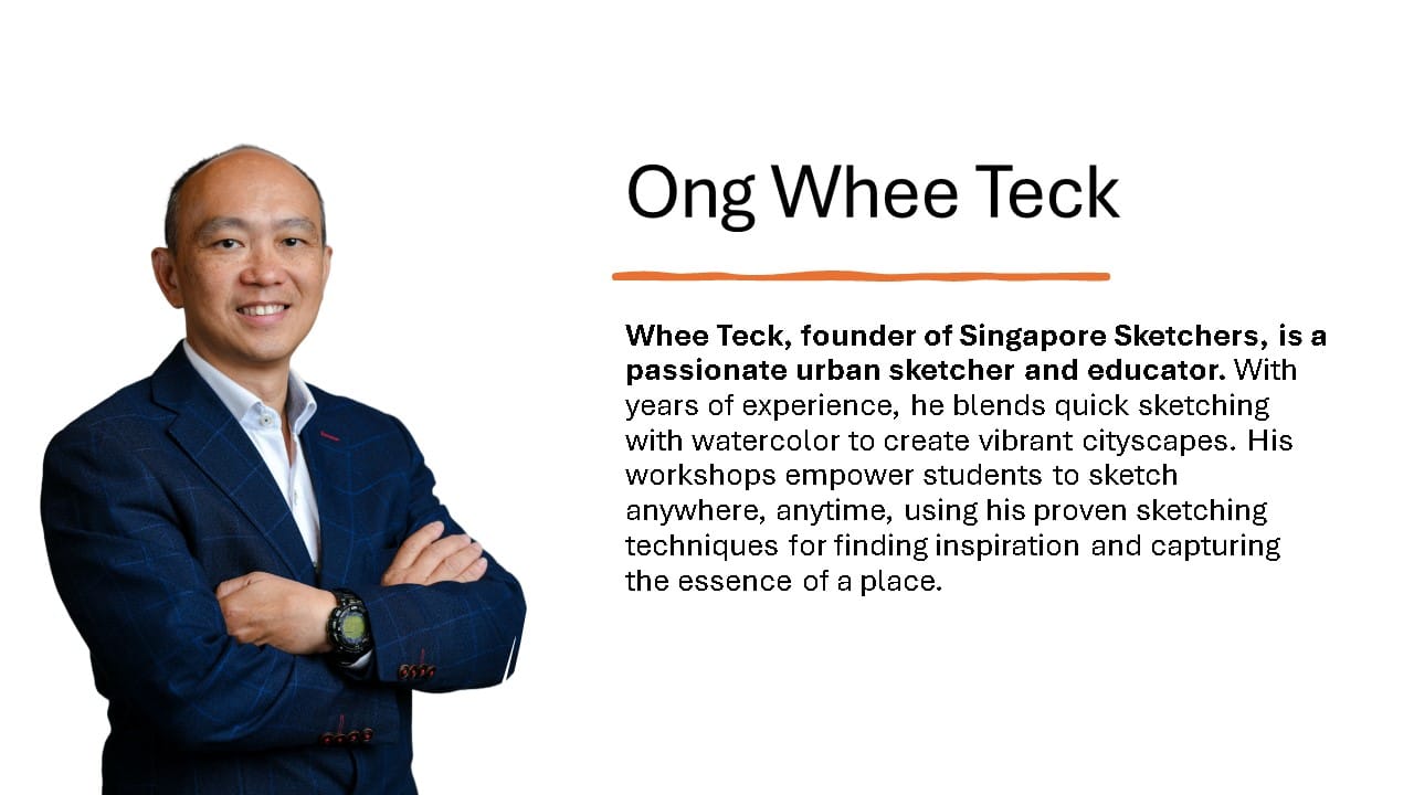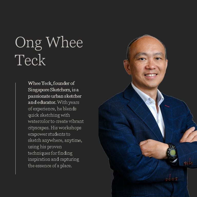Whee Teck, founder of Singapore Sketchers, is a passionate urban sketcher and educator. With years of experience, he blends quick sketching with watercolour to create vibrant cityscapes. His workshops empower students to sketch anywhere, anytime, using his proven sketching techniques to find inspiration and capture the essence of a place.