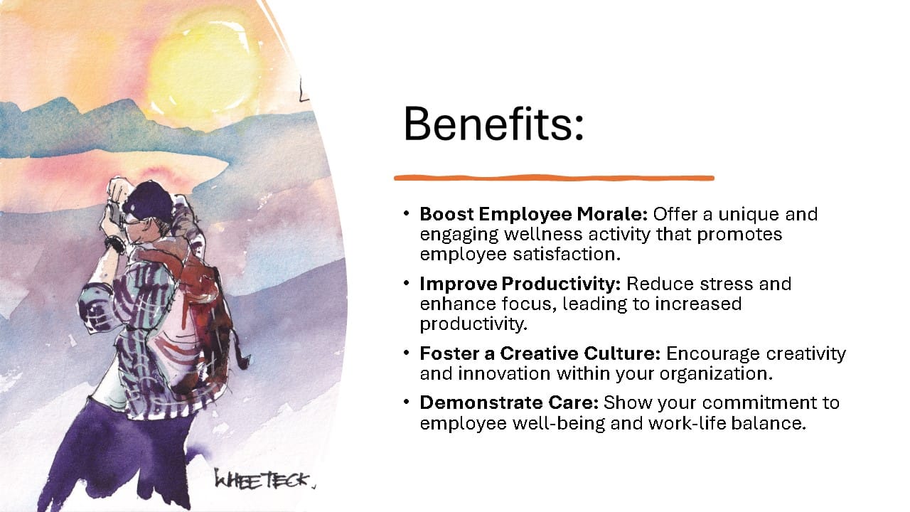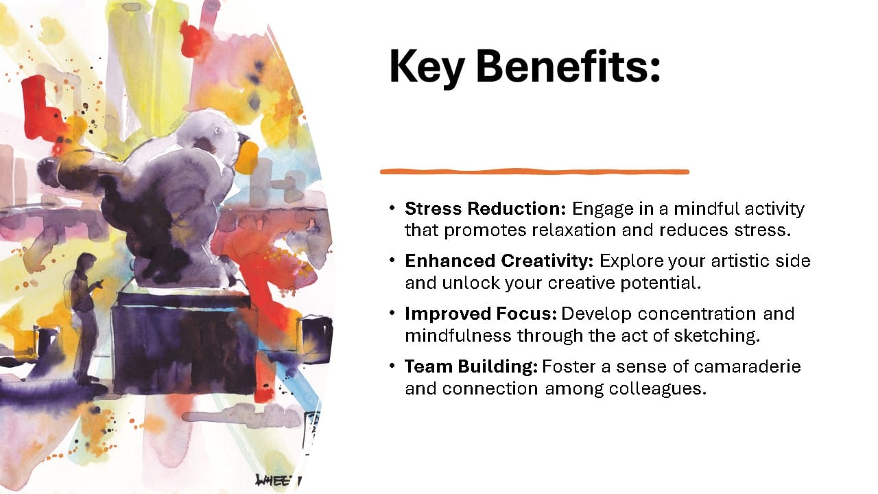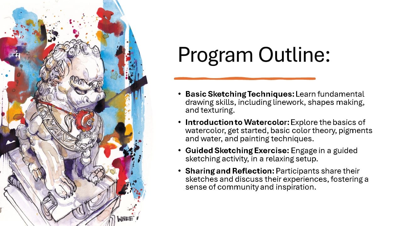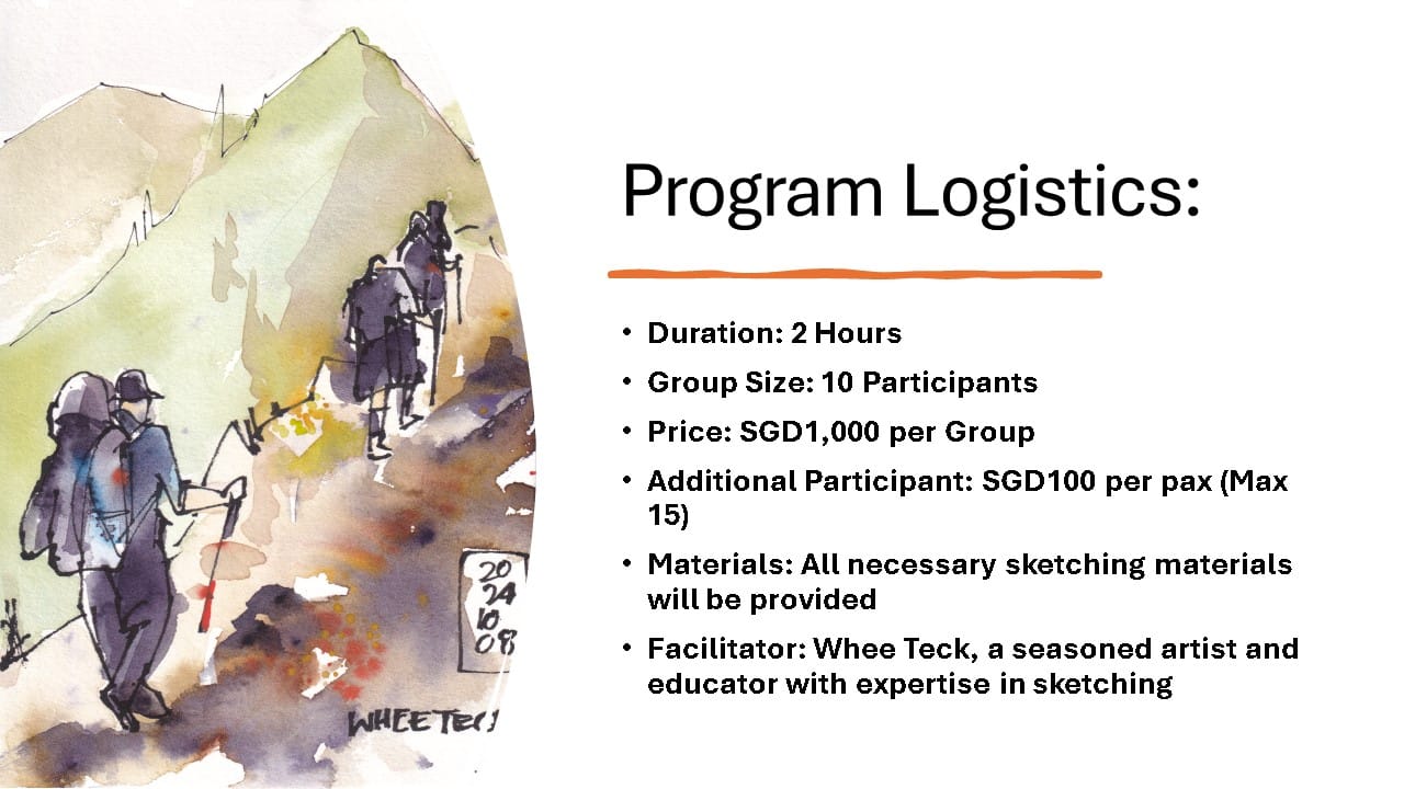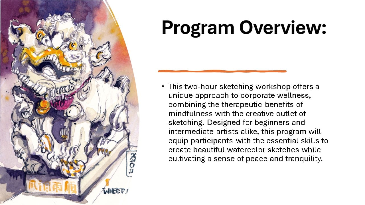 In this sketching program, Whee Teck will provide all necessary sketching materials. However, feel free to bring your own if you prefer. The workshop is designed for beginners, covering the fundamentals of drawing and watercolour sketching. While the focus is on beginners, Whee Teck can offer additional tips and guidance to more advanced participants during the session. This program is ideal for corporate wellness initiatives. Learning artistic skills can be a relaxing and mindful experience, fostering a sense of calm and well-being.